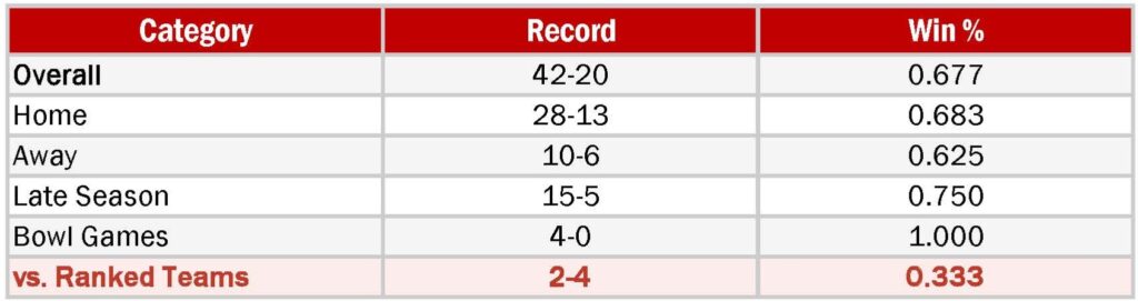 The bowl record is perfect. The late-season numbers are strong. But look at the bottom row: 2-4 against ranked teams. That’s a .333 win rate when games matter most.