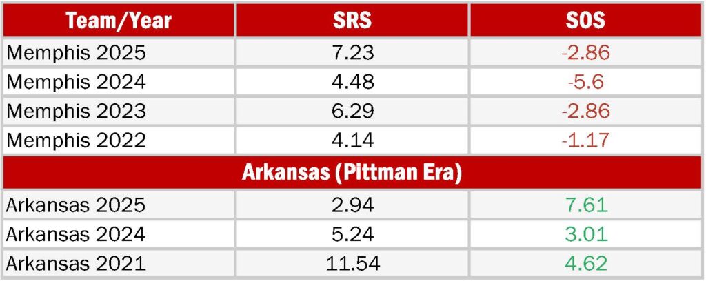 This is where the data gets uncomfortable. Every single season at Memphis, Silverfield coached against a negative strength of schedule. Every season at Arkansas – even in Pittman’s worst years – featured a positive.