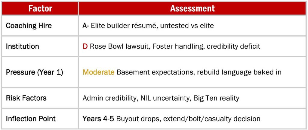 Here’s what I’ll stand by: The questions were legitimate. A 20-30 coach with an 0-2 bowl record and a pattern of close losses deserved scrutiny. The pressure was real.