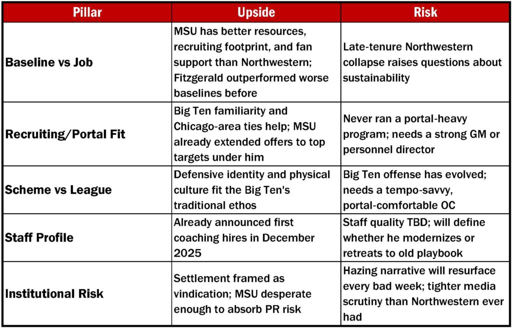 Fitzgerald elevated Northwestern beyond its resource baseline. Michigan State offers more to work with than he ever had in Evanston. The price is reasonable. The upside is real.