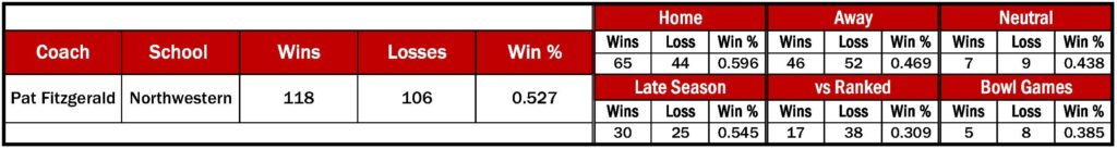 Pat Fitzgerald went 118-106 in 17 seasons at Northwestern.